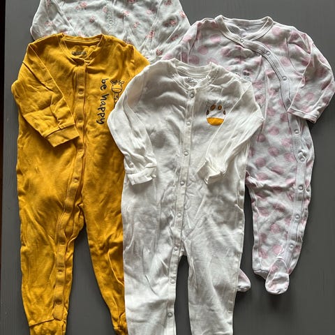 To sett med pysjer fra Name it brukt av tvillinger. Klespakke med to grønne pysjamaser med dinosaur og to pysjamaser med traktorer.