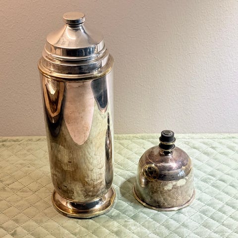 En mugge/vase i nysølv, Art Deco, 1930-tallet, merket OSP 40. Høyde 18/23,5 cm.Dette er en svensk Art Deco kannevase fra 1930-tallet, sølvplett, med et slankt og minimalistisk geometrisk design.