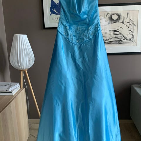 Kjole til spesiell anledning i størrelse S, laget av tyll i blå farge. Designet for kvinner, egnet til formelle anledninger.