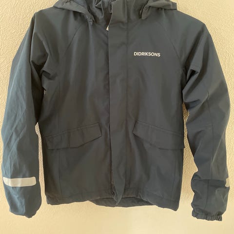 Lite brukt Didriksons barnejakke i størrelse 130, farge blå, laget av polyamid, polyester. Jakken er designet for unisex bruk og har hette med fuskepels. Innvendig foret med mykt materiale for ekstra komfort. Kan strammes inn nederst. Vann og vindtett.