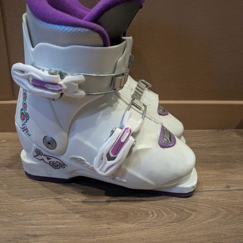 Alpina skisko med glidelås foran. Skoene har svart og hvit farge med solid såle. De er pent brukt