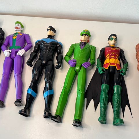 Marvel actionfigurer sett med 12 ulike karakterer inkludert Hulk, Iron Man, Black Panther, Joker, Wonder Woman og flere. Figurene varierer i størrelse og er laget av plastmateriale. Passer for samlere og som lekefigurer.