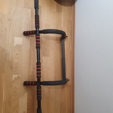 Pull-up bar som kan monteres i dørkarm. Laget i metall med polstrede håndtak for bedre grep. Justerbar lengde for tilpasning til ulike dørkarmer. Kan brukes til styrketrening hjemme.