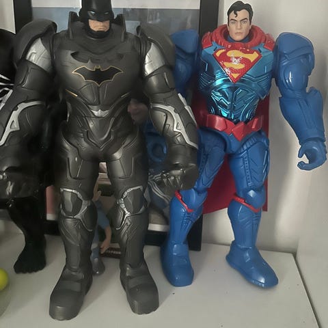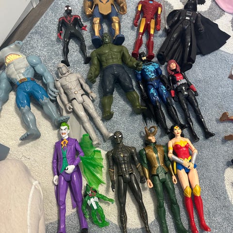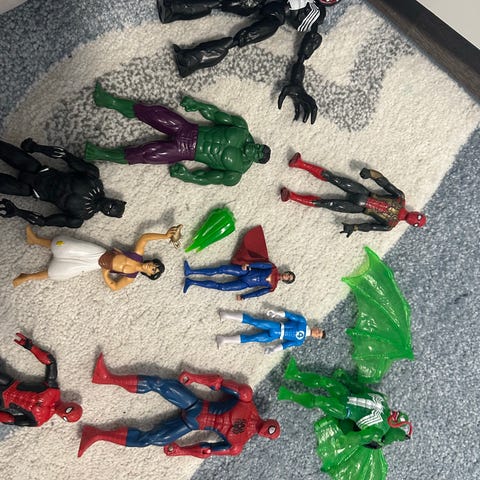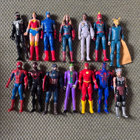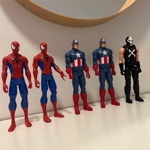 To actionfigurer av Spider-Man og Venom. Figurenes størrelse og materiale er ikke spesifisert. Figurenes farger er hovedsakelig rød og blå for Spider-Man, svart og rødt for Venom.