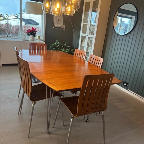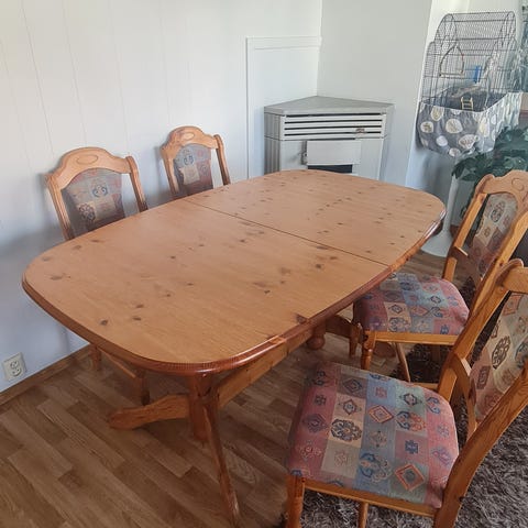 Eldre solid spisebord med stoler selges pga flytting. Klaffer følger med og da kan alle 10 stolene plasseres med bordet. Det er tungt og solid, sammen med gode stoler.