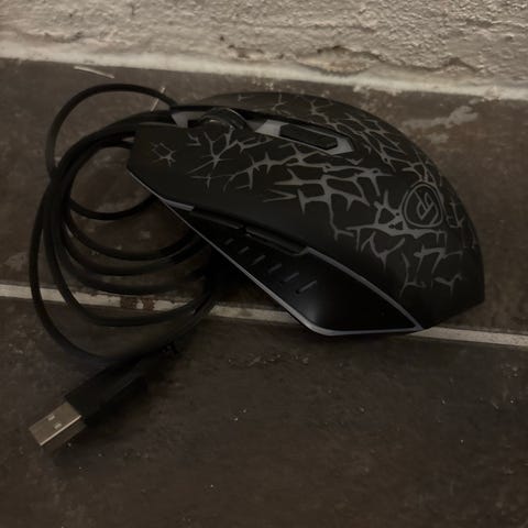 DG gamingmus med kablet tilkobling. Musen har en ergonomisk utforming med flere knapper og en tekstilbelagt kabel. Passer til bruk med PC for spill og generell databruk.