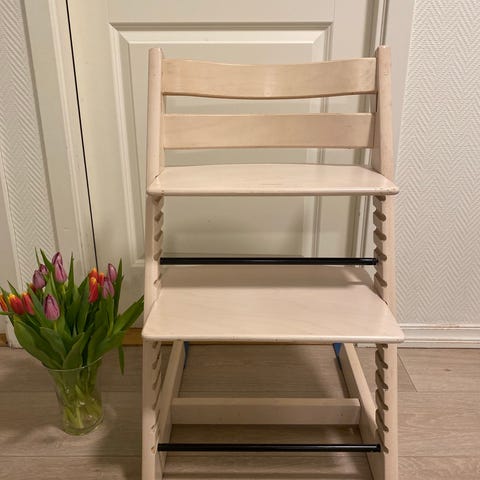 Stokke Høy barnestol i svart farge. Stolen har justerbar sitte- og fotplate, og er designet for barn. Laget i robust materiale for stabilitet og sikkerhet.