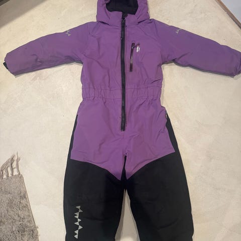 Dressen er godt brukt av ett barn ett par sesonger. Noe slitasje på knær og rumpe, men ikke noe som går utover bruk. Noe falming etter vask. Den er lagt ned ved å fjerne stråkletrådem på innsiden.