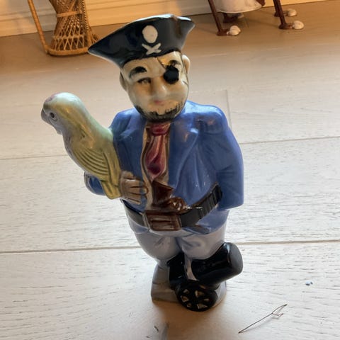 Beskrivelse av karaffelen: En keramisk karaffel formet som Sandemans ikoniske figur “The Don” – en kappekledd mann med bredbremmet hatt og et glass portvin i hånden. Karaffelen er opprinnelig fylt med Sandeman Partner’s Port.