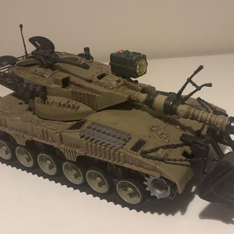 Radiostyrt tanks (batteri). Kjører som den skal og skyter med kanonen (lyd). Tårnet roterer ikke lenger og kanonen kan heller ikke heves/senkes som den gjorde før