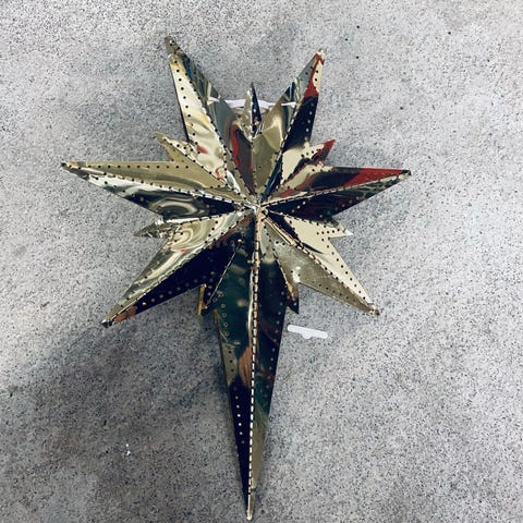 Gammel rødmalt lysestake i tre i orginalembalasje selges. Litt sprukket og brent av lys, se bilder.
