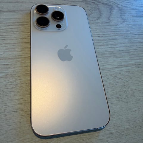 Apple iPhone 16 Pro mobiltelefon med 256 GB lagringskapasitet. Enheten er i fargen naturlig titan og leveres med original emballasje, original ladekabel (ubrukt) og to deksler. Merkene Later case og Nudient.