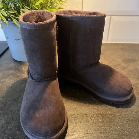 UGG barnestøvler i størrelse 28, 5 designet for unisex bruk. Støvlene er laget av beige semsket skinn med en myk og varm innside. Sålen har godt mønster for grep. Passer til daglig bruk i kaldt vær.