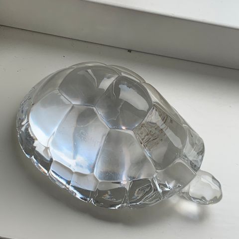 Glasskulptur formet som en skilpadde. Gjennomsiktig materiale med detaljer som etterligner skilpaddens skall og lemmer.