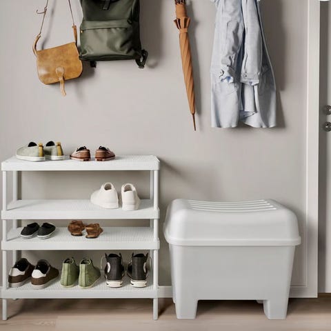 Oppbevaringsstativ med tre hvite plastkurver og kromfarget metallramme. Stativet er designet for å organisere og oppbevare små gjenstander. Kurvene har hull for ventilasjon og stativet står på gulvet. Passer for bruk i baderom, vaskerom eller andre rom hvor ekstra oppbevaring er ønskelig.