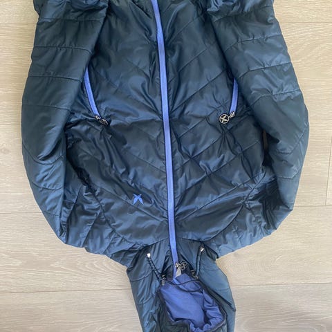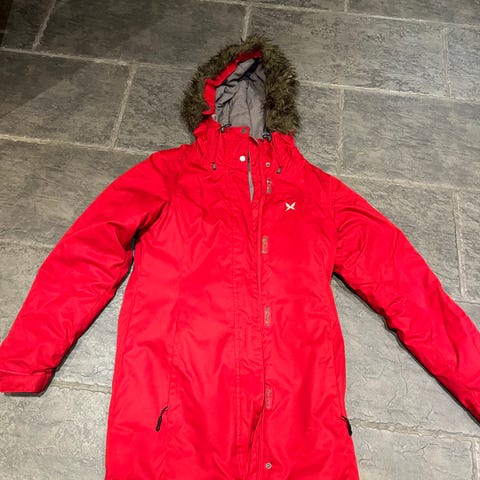Kari Traa vinterjakke for dame i størrelse M. Jakken er grå med rosa innerfôr. Den har hette og er polstret for ekstra varme. Jakken har ribbestrikkede mansjetter. Det er synlige bruksspor på jakken, inkludert slitasje på ermene.