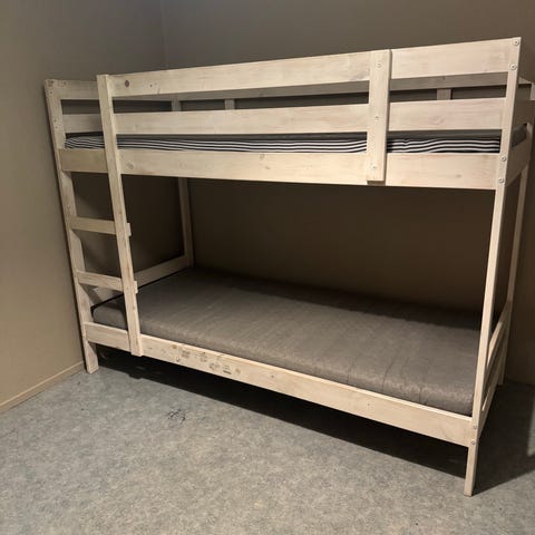 Solid barneseng med rom under sengen til oppbevaring, lek etc. Haøyde under sengen er 74 cm, total høyde er 111 cm. Madrass-lengde 200 cm, 205 cm i ytterkant av sengerammen. Passer til 90 cm madrass, 95 cm ytterkant av sengerammen. Noen bruksmerker, se bilde 4 og 5, bilde 6 viser delvis knekk i den ene bunnplanken.