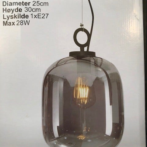 Glass i litt mørkere enn klart glass, røkfarget. Med prisen følger med lyspære (dimbar) og ledning. Koppen følger ikke med.