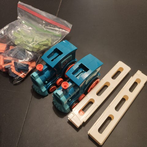 Fikk i julegave. 2 x dominotog som setter opp dominobrikker. Selges pga altfor mange leker. Fikk i julegave, kun brukt 1 gang. Ny pris pr stk: 238kr.
