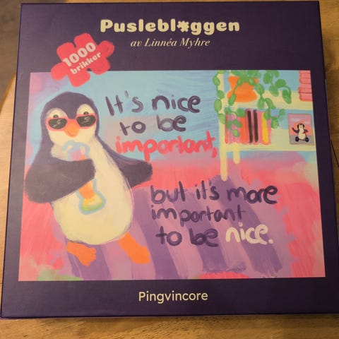 Estetisk fint og høykvalitets puslespill selges for 200kr. Puslespillet består av 1000 brikker, hvor motivet er en pingvin som koser seg ved teksten «It’s nice to be important, but it’s more important to be nice». I esken følger også klistremerker og en plakat med puslespillets motiv med.