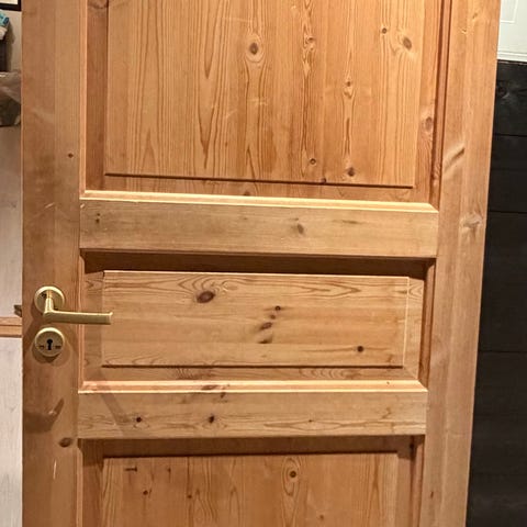 Døren ble kjøpt ny og installert for en måned siden. Selges fordi vi skal bytte til en dør som matcher bedre med en annen eldre dør i rommet.