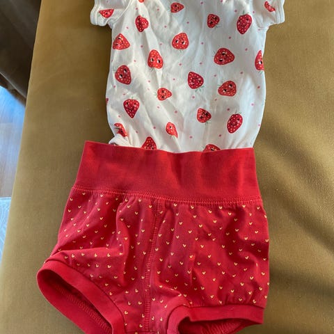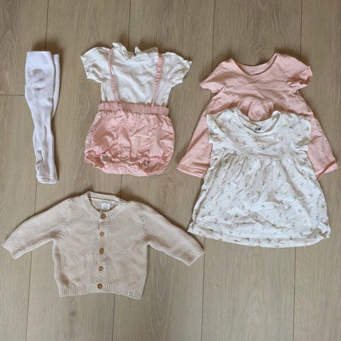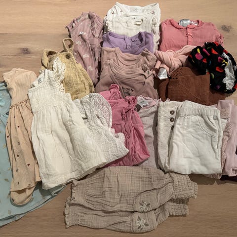 Selger en søt og sommerlig klespakke med jenteklær i størrelse 68/74. Perfekt til varme dager, ferie eller som sommergarderobe.