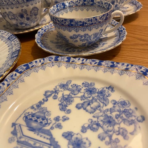 Baksiden av tallerkenen er merket: P T Bavaria Tirschenreuth Germany Der Hackefors 3 Mod. V. Thea Dek. Sachsen. "Theresia" modell med "Sachsen" dekor/mønster.