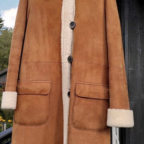 Klassisk og tidløs kåpe i ekte lammeskinn med myk saueskinnsfôr på innsiden. Kåpen er varm og solid, perfekt for kalde vinterdager.