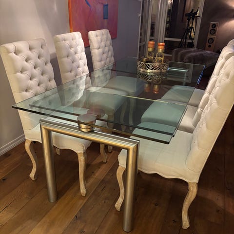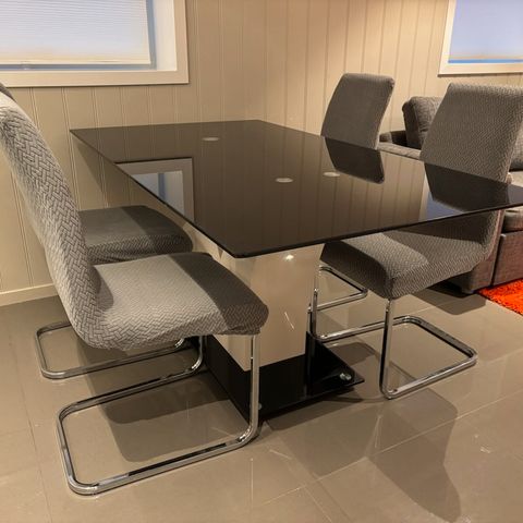 Stilrent og moderne spisebord med glassplate og solid krom/metallunderstell selges rimelig. Bordet fremstår som pent brukt og er svært stabilt. Den blanke glassplaten gir et eksklusivt uttrykk og er enkel å holde ren.