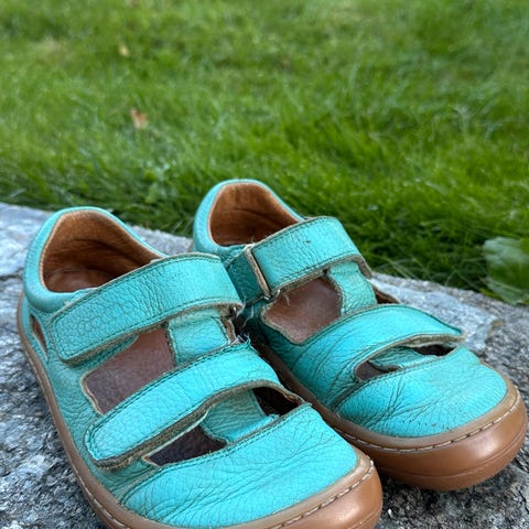 Froddo barfotsko i størrelse 30, unisex, i brun farge. Skoene har borrelås for enkel på- og avkledning og er foret med mykt materiale.