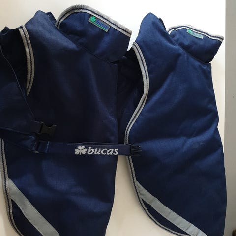 Bucas hundedekken 300g i blå farge med refleksdetaljer. Dekkenet er designet for hunder og har justerbar stropp rundt magen for bedre passform. Materialet er slitesterkt og egnet for utendørs bruk.