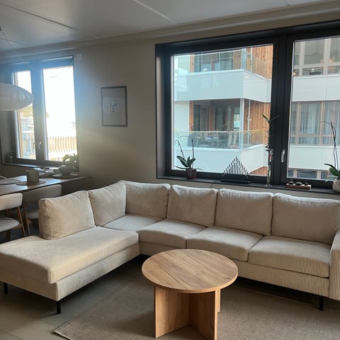Selger en nydelig og moderne hjørnesofa i grå farge. Sofaen er svært lite brukt og fremstår som nesten ny. Den er både komfortabel og romslig, perfekt for avslapning eller besøk.