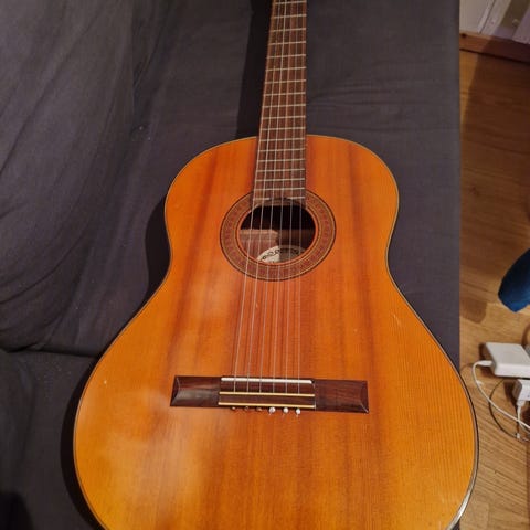 Santana Model No 576 er en akustisk gitar med klassisk design. Gitaren har en naturlig tre-finish og nylonstrenger. Den er laget for å gi en tradisjonell lyd og spillbarhet, egnet for nybegynnere og viderekomne gitarister. Mangler en streng, men har nye som følger med. Gitaren er kjøpt i 80 tallet.