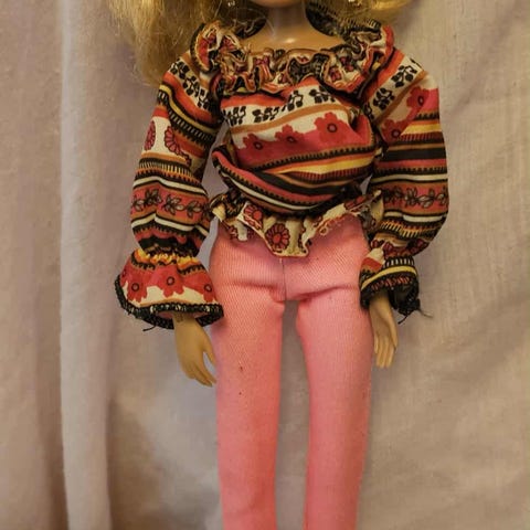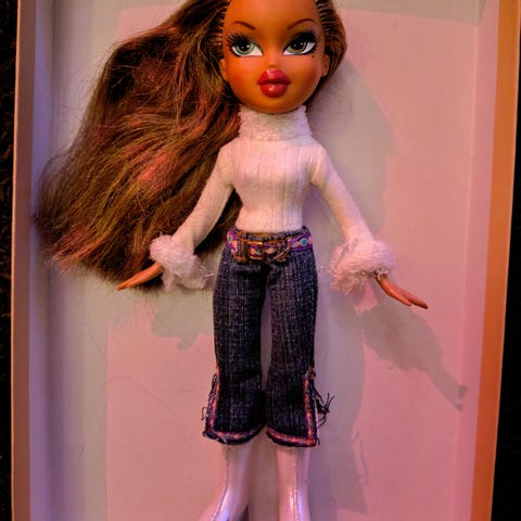 Bratz Meygan med rødbrunt hår, iført rosa topp og blågrønne jeans med rosa detaljer. Dukken har tilbehør i form av en rosa børste. Håret er rent, vasket og uklipt.