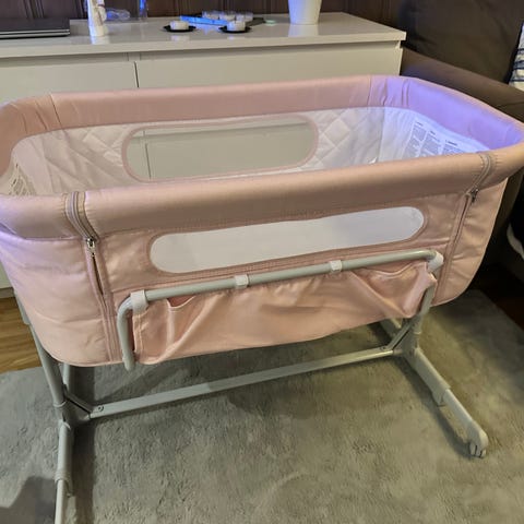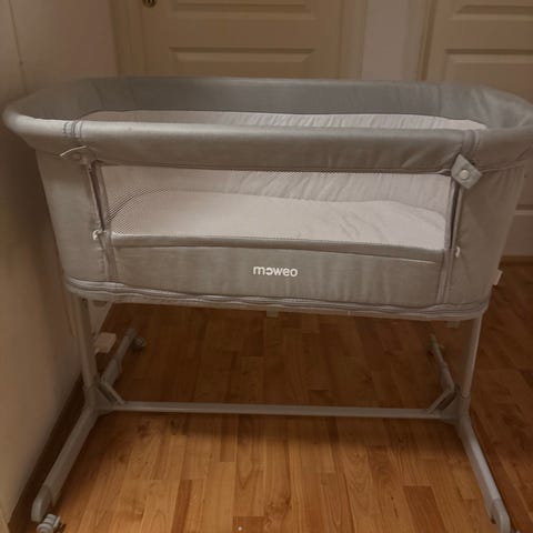 Moweo Next To Me Bedside Crib er en grå bedside crib. Den har justerbar høyde og hjul for enkel plassering ved siden av voksen seng. Laget med materialer som gir god ventilasjon og trygghet for barnet.