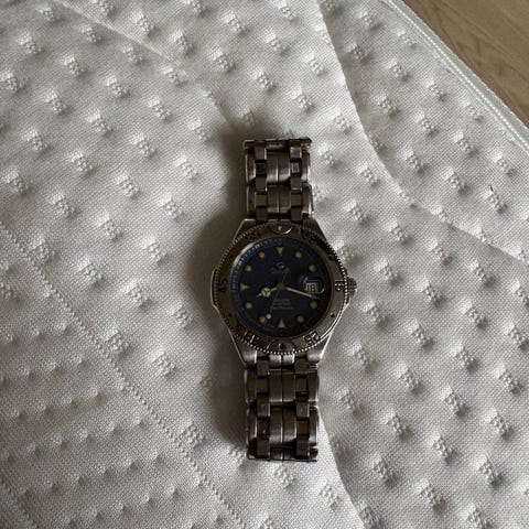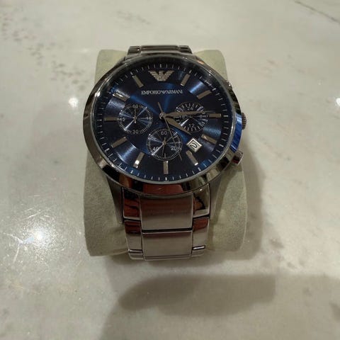 Armani herreklokke med rustfritt stål lenke og svart urskive. Klokken har flere funksjonsvisere på urskiven og en robust konstruksjon. Passer for daglig bruk og formelle anledninger. Helt ny batteri -trykktestet 50 atm er ok og ultralydd renset. Klokken er presis . Lenka er ok låsen er ikke slitt . Klar til bruk.