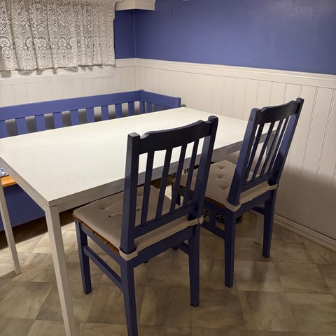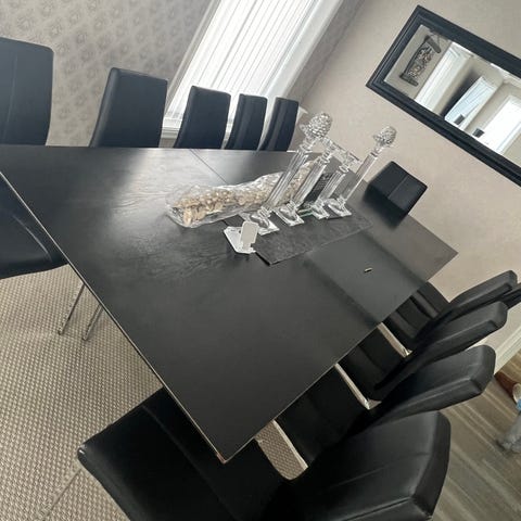 Stor spisebord 240 lengde når den er åpen. 180 cm når bordet er klappet sammen. Stoler følger med