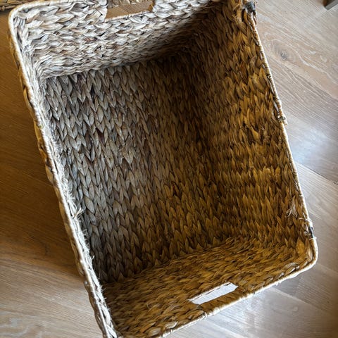 Water Hyacinth Fishbone er en skittentøyskurv fra Dixie, laget av håndvevd vannhyacint med et hvitt stoff på innsiden.