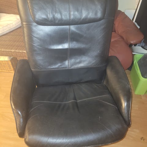 Én stol igjen! Den er tatt godt vare på og har lite slitasje for alderen. Skinnet er helt, også på de mest utsatte områdene.