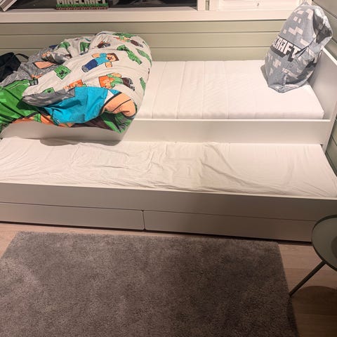 IKEA uttrekkbar seng for barn med metallramme i turkis farge. Sengen kan trekkes ut for å gi ekstra liggeplass og har lamellbunn. Passer for barn og kan brukes i barnerom. Madrass medfølger.