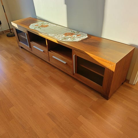 Selger pent brukt TV-bord BESTÅ fra IKEA med dører i eikemønster.