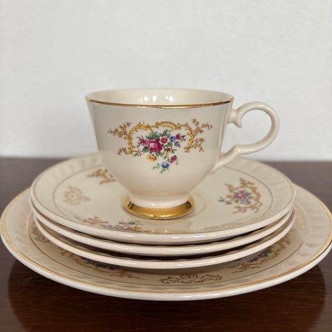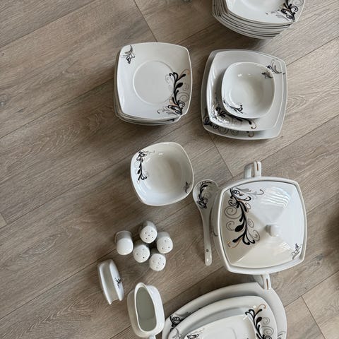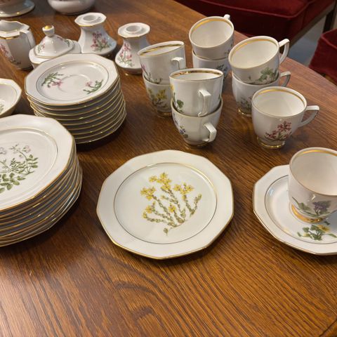 Nydelig servise til 6 stykker. I god stand tross alder. Fin glans og . Følger med 2 ekstra skåler, 1 asjett, 1 egge glass og en stor sukker- kopp. Ser at det er l krakkeleringer på sukker- koppen ,egge glass og to ekstra skåler sukker- koppen har et lite nag innvendig i kant øverst, men ikke synlig. Kjennes med finger. . Skal se ekstra over servise i dagslys. NB Har også et sause- nebb som kan følge med om ønskelig. Lite nag i underkant . Må kjennes med finger, synes ellers ikke . NB Går ikke mere ned i pris Sender kun med Post Nord 129kr eller Norges-pakken 135kr-
