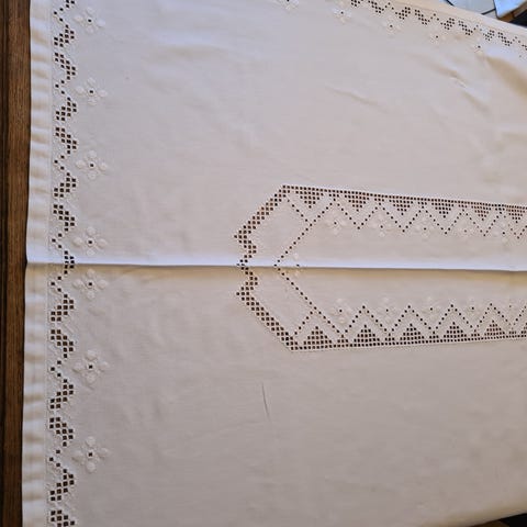 Ny, ekstra lang, ubrukt og uåpnet i originalemballasjen hvit Damask duk fra Cleo Home. Bredde 160 x 340 cm. 40 % lin, 60 % lin. Kan sende med ønsket fraktselskap fra kjøper.