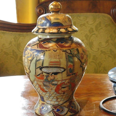Keramisk lokkkrukke med blå og beige dekor, utsmykket med mønstre av mennesker og naturmotiver. Krukken har en rund form med lokk og detaljer i mørk blå og beige farger. Egnet for oppbevaring eller dekorasjon.