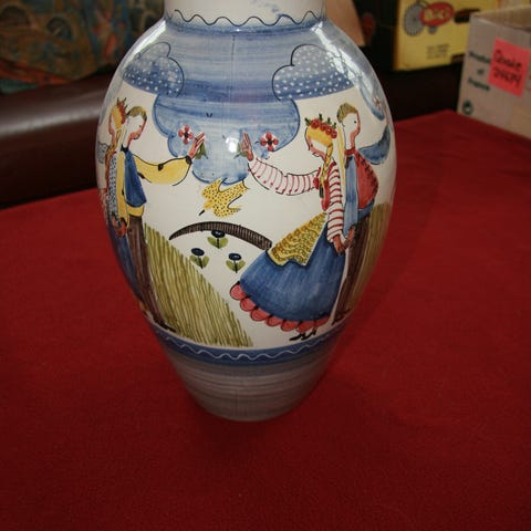 Keramisk lokkkrukke med blå og beige dekor
