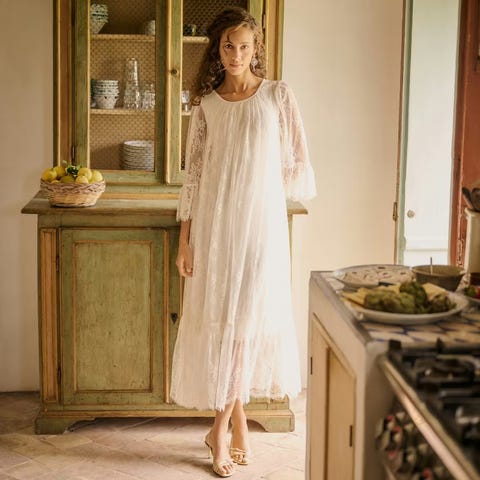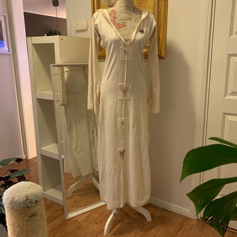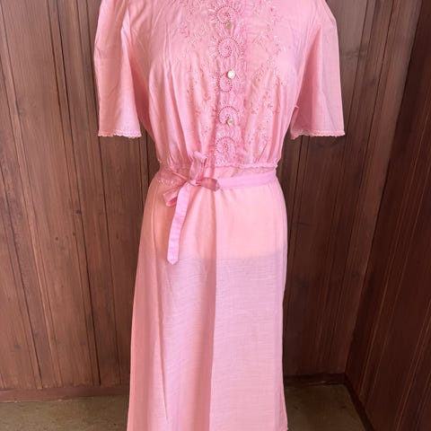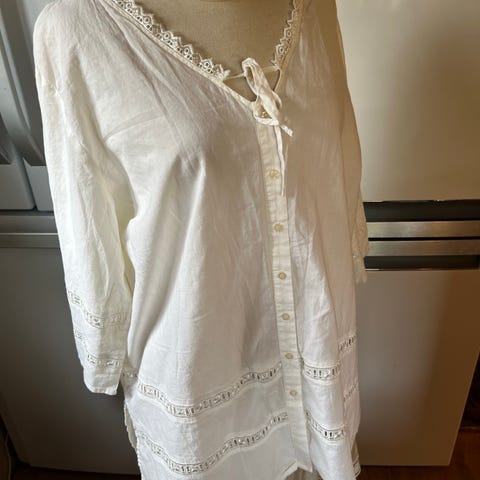 Lang lysegrønn vintage nattkjole med krage, knepping og blonder på brystet og mansjettene.