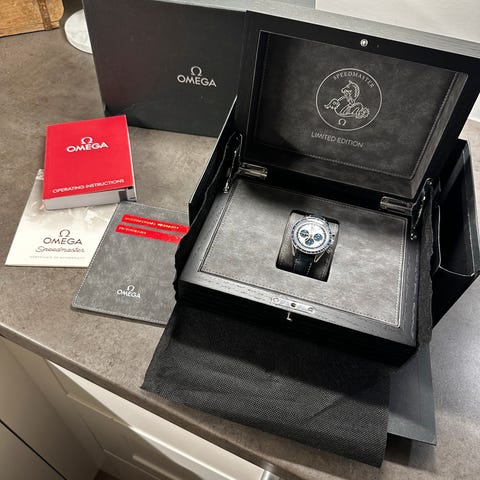 Selger en pen og velholdt Omega Speedmaster Reduced 39mm fra 1998. Kommer komplett med boks, original lenke, samt to uoriginale skinnremmer og en gummirem med deployment clasp. Ukjent servicehistorikk, men har tikket og gått upåklagelig i mitt eie. Bruksmerker finnes, men ingenting sjenerende. Krystallen er hesalite, som kan trenge en polering. Ingen dype hakk, se bilder. Lenke er tilpasset håndledd på ca 17 cm nå, men følger med 3 ekstra ledd.