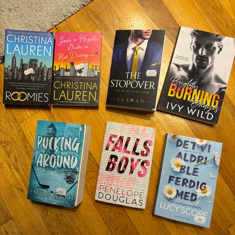 Pakke med bøker av forskjellige forfattere, inkludert titler som 'Tre ønsker' av Liane Moriarty, 'Atlas' av Lucinda Riley, 'Mellom verden' av Ta-Nehisi Coates, 'Sara Jio' og 'Cecilia Ahern'. Bøkene har varierende temaer og sjangere.