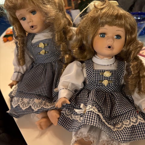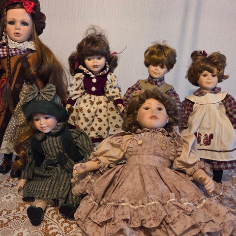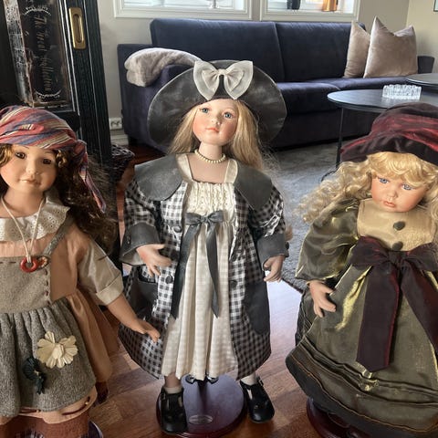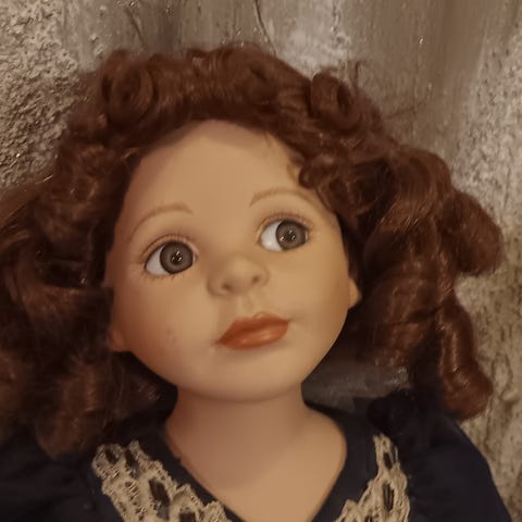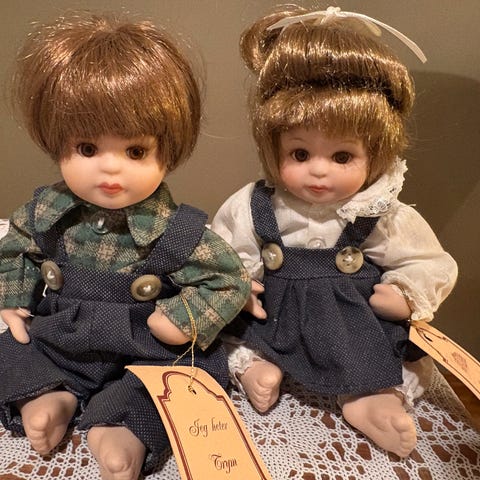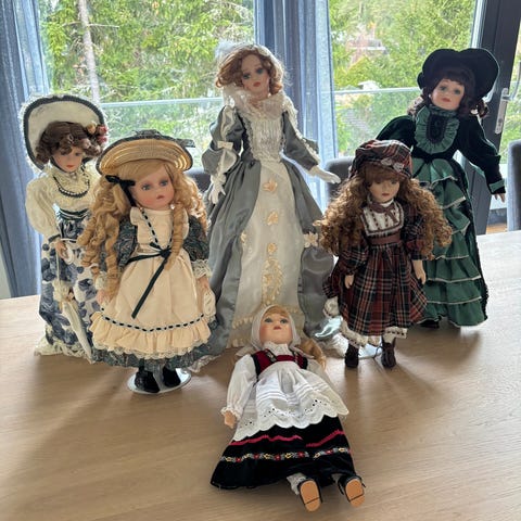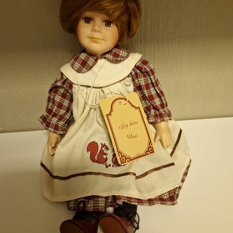 Perfect Heart Collection dukke med rutete kjole i grønt, rødt og hvitt, hvit bluse med blonder og rød rosedetalj, hvite sokker og blå sko med knapper. Dukken har langt, lyst hår i fletter og blå øyne. Egnet som samlerobjekt eller dekorasjon.