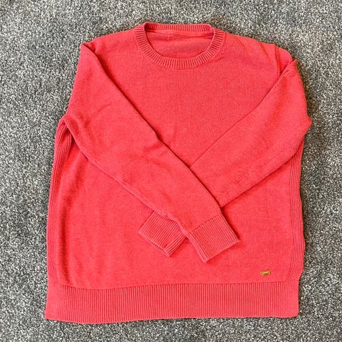 Jean Paul genser i størrelse S, laget av bomull, i fargen rødoransje. Genseren har flettestrikk. En klassiker. Lekker til hvite jeans